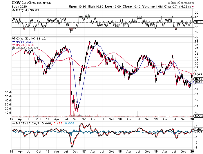 이 회사는 민영(민간) 교도소 주식이다. 미국은 범죄자가 하도 많아서 오래전부터 민간 회사가 교도소를 운영하고 있다. 이 회사들은 정부한테 사업권을 따내는 거다. 세금으로 돈버는 회사라고 보면 된다.