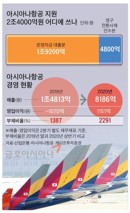 아시아나항공의 올 상반기 부채총계는 11조5459억원. 부채비율 2291.01%로 지난해 말(1386.69%)보다 904.32%포인트 증가. 1년 동안 갚아야 하는 단기 차입금은 2조원이 넘는다.