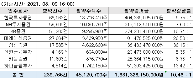 대표 주관사인 NH투자증권과 한국투자증권의 청약 경쟁률은 각각 7.60대1, 9.75대1을 기록했다. 공동주관사인 KB증권의 경쟁률은 10.74대1, 인수단으로 참여한 ▲미래에셋증권 26.50대1 ▲삼성증권 36.15대1 ▲신한금융투자 5.35대1 ▲키움증권 6.75대1 ▲하나금융투자 13.42대1로 각각 나타났다.