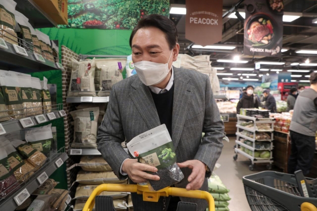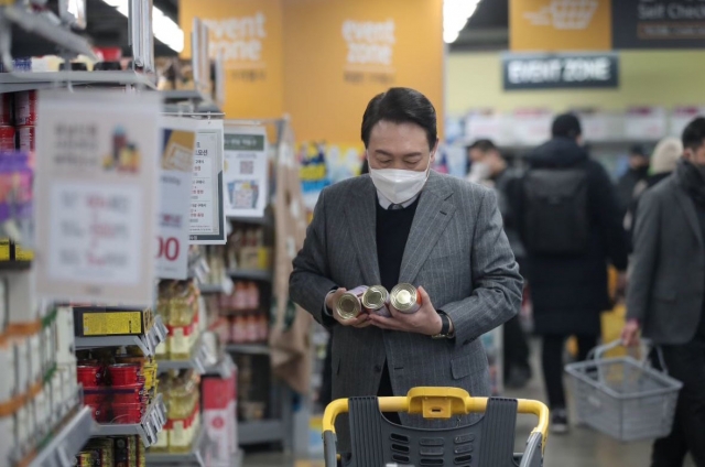 윤석열 국민의힘 대선 후보가 8일 서울 이마트 성수점에서 장을 보며 밥상물가, 방역패스 문제 점검을 하고 있다. 뉴시스