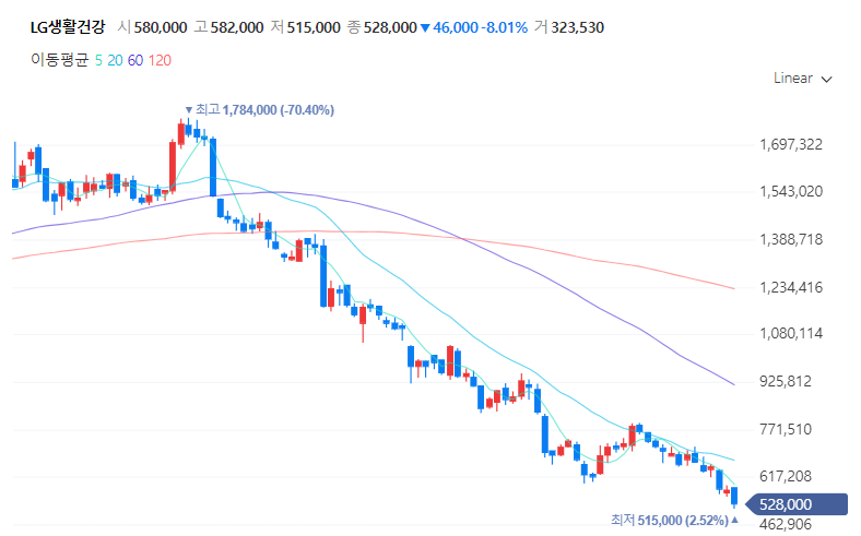 LG생활건강(051900)이 올해 3분기 부진한 실적을 이어갈 것으로 전망되면서 장 초반 52주 신저가를 기록하고 있다.