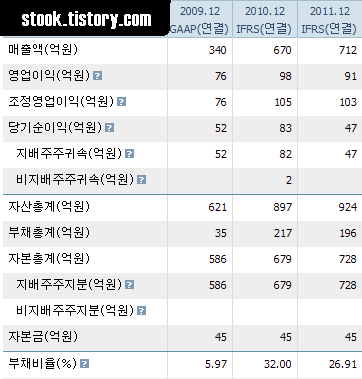 2012년 매출액 712억원, 영업이익 91억원 당기순이익 47억원을 달성하였다. 현금 배당률 3%를 주는 전형적인 가치주 회사이다. 부채비율은 27%이며, PER 6배, PBR 0.4배의 안정형 성장 기업이다.