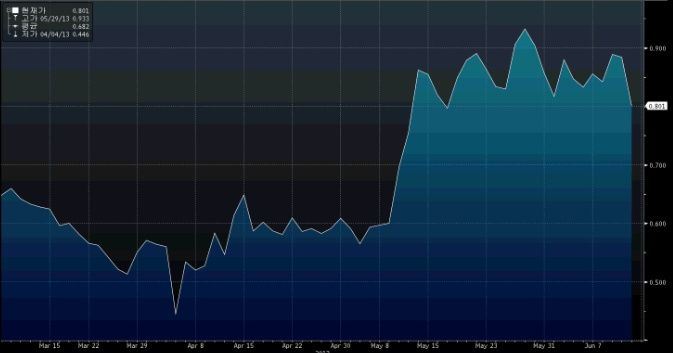일본 국채 수익률 차트를 보자. 4월부터 보여준 일본 10년물 국채 수익률의 상승은 긍정적으로 보여졌다. 경제 회복이 나타나고 인플레이션율이 상승하는 모습을 보여주었다.그러나 오늘 0.8%대에서 공방을 벌이고 있다.
