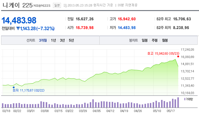 일본주식 시장이 오전장에서 5% 대 하락을 하며 12000선으로 내려왔다. 5월 23일 장중 15,000원을 돌파했던 니케이는 불과 20일 만에 20% 하락을 겪고 있다. 아베노믹스에 무엇인가 문제가 생긴것으로 볼 수 있다. 일본은행이 더이상 추가적인 양적완화 정책을 내놓지 않고 있기 때문으로 생각된다. 또한 전일 세계은행은 세계 경제성장률을 종전 2.4%상승에서 0.2% 하락한 2.2% 상승으로 하향 조정했다.