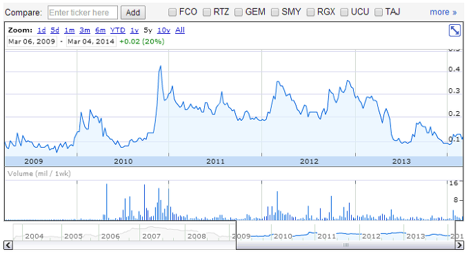 울프마이닝. 이름 멋있다고 생각했는데, 탐욕적인 주식이고, 탐욕의 이름인것 같다. 왜 이번에 개봉한 영화 '더울프 오브 월스트리트'에도 울프가 나오지 않는가. 서양인에게 늑대는 탐욕의 동물인것 같다. 이 주식은 현재 주당 0.12CAD에 거래되고 있다. 주가흐름을 보면 5년동안 가장 높았을 때 0.4CAD를 돌파했었다.